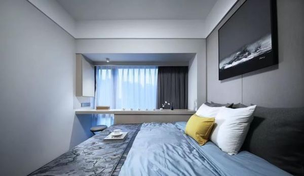 臥室在靠窗位置裝了個書桌,滿足主人日常在家辦公加班的需求。窗臺與書桌相連,貫穿了整個窗戶,擺上精致的擺飾,讓空間彌漫了一股禪意的氣息。